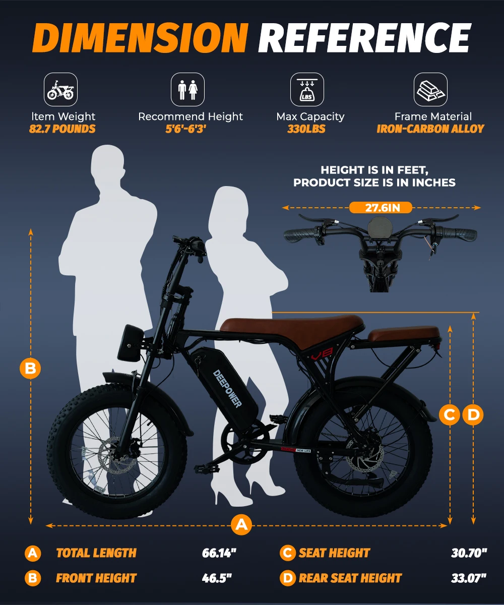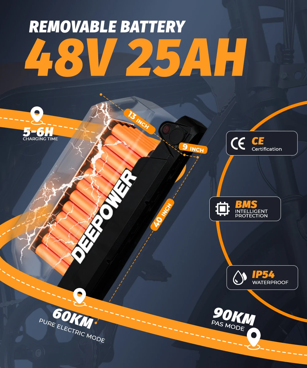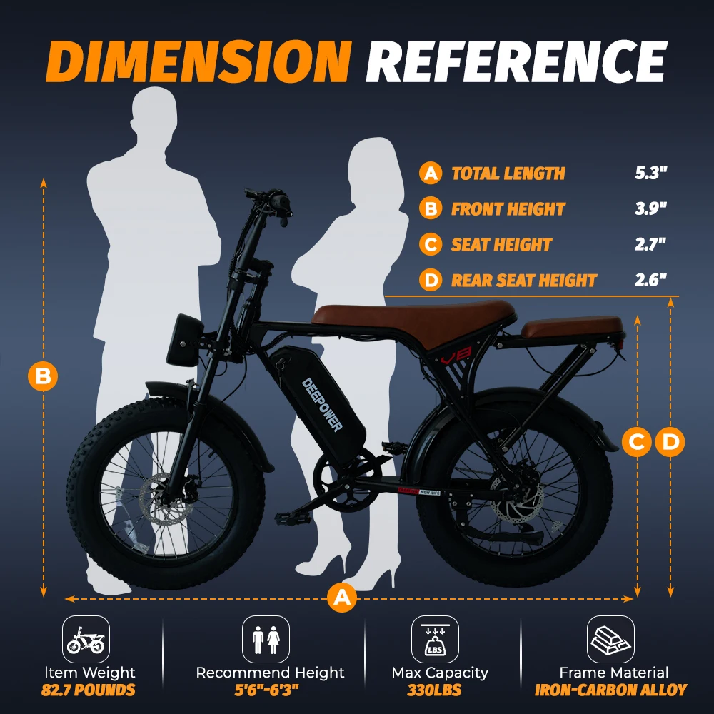 Bitte beachten Sie: Unser V8 verfügt nicht über eine 7-Gang-ÜbertragungWir sind DEEPOWER, ein engagierter Hersteller von Elektrofahrrädern leistungsstarke, umweltfreundliche E-Bikes für den globalen Fahrer.Unser Engagement für Modernstes Design, langlebige Batterietechnologie und intelligente Mobilitätslösungen ermöglicht Ihnen den Weg zur Arbeit mühelos und nachhaltig, überall.Warum DEEPOWER wählen?✅ Premium-Qualität und Sicherheit: Strenge zertifiziert (CE, UL, FCC) für Langlebigkeit und Sicherheit.✅ Intelligente Technologie: Nahtlos integrierte Batteriesysteme und intuitive App-Konnektivität.✅ Schnelle globale Lieferung: Weltweite Abdeckung unterstützt durch mehrere Überseelager (USA, EU und darüber hinaus) für einen schnellen Versand.✅ OEM/ODM-Expertise: Willkommen bei kundenspezifischen Designs und Großbestellungen – erwecken Sie Ihre Vision zum Leben.🚀 Schneller und bequemer Versand aus lokalen Lagerhäusern!Genießen Sie3-10 Tage Lieferung von Tür zu Türdirekt von unsÜberseelager in den USA und Europa.Keine langen Warten oder komplexen Zollprobleme mehr!✨ Kaufen Sie mit Vertrauen ein und sparen Sie:Folgen Sie unserem Shop für exklusive Gutscheine!Nahtloser Dropshipping:Wir unterstützen Dropshipping mitMarkenfreie Verpackung– perfekt für Ihre Geschäftsanforderungen.Ersatzteile benötigen?Kontaktieren Sie jederzeit unseren Kundenservice für Batterien, Reifen, Bremsen oder andere Komponenten.✅ Zertifizierte Qualität und Seelenfrieden:EU CE-zertifiziert:Unsere E-Bikes erfüllen europäische Sicherheitsstandards für rechtliches und sorgenfreies Fahren.Zuverlässige Garantie:1 Jahr kostenloser Ersatz:Für kritische Teile wie Batterie und Motor.Verbrauchsteile:Kaufen Sie bei Bedarf ganz einfach Ersatz (z. B. Reifen, Bremsbeläge).Bereit für eine reibungslose Fahrt?Entdecken Sie jetzt unseren Shop!Weltweit zertifiziert und geliefert!✅ EU-zertifizierte Exzellenz:Unsere Produkte erfüllen strenge EU-Standards (CE-zertifiziert) für garantierte Qualität und Einhaltung.⚡ Weltweite Reichweite, lokale Geschwindigkeit:Nutzen Sie unser globales Netzwerk und mehrere Überseelagerschnelle, problemlose Lieferungzu Ihrer Haustür.Bitte beachten Sie:1.Die anfängliche Geschwindigkeit des Fahrrads beträgt 25 km/h.Wenn Sie 50 km/h erreichen möchten, müssen Sie die Geschwindigkeitsbegrenzung entfernen.2.Unsere Preise verstehen sich inklusive Steuern, es fallen keine Zweitgebühren an!3.Wenn Sie Probleme mit dem Elektrofahrrad feststellen, das Sie erhalten haben, wie z. B. beschädigte Verpackung, fehlendes Zubehör, Qualitätsprobleme usw., kontaktieren Sie mich bitte so schnell wie möglich und ich werde das Problem für Sie lösen.Wenn Sie auf Probleme stoßen, die nicht gelöst werden können, werde ich Ihnen einen Rückgabe- und Rückerstattungsservice anbieten.Spezifikation:Rahmenmaterial: EisenSitzmaterial: PVC-LederWasserdichtigkeitsgrad: IPX4Motor: 48V1000 bürstenlosAnzeigematerial: LCDAnzeigeinhalt: Gang, Akku, Geschwindigkeit, akkumulierter Kilometerstand, PAS, mit USB-LadeanschlussPedalmaterial: HalbaluminiumPedalgröße: 10×7×2,8CMBatterieinformationen: 48V20Ah (optional)Informationen zum Ladegerät: DC2.5, 48V2AMaximale Geschwindigkeit: 50 km/h entladenMaximale Kilometerleistung: 75–90 kmKletterkapazität: max. 35 Grad.Scheinwerfer: LEDBremse: ScheibenbremseLadezeit: mehr als 6 StundenMaximale Tragfähigkeit: 150 kg„Reifen: 20“*4,0“Stoßdämpfer: Doppelschulterige Eisenbeine aus Aluminium, verriegelbare StoßdämpfergabelStoßdämpfungssystem: Doppelschulter-Vorderstoßdämpfer mit zwei Schultern, mit mittlerem StoßdämpferFahrmodus: Reiner elektrischer Modus + HilfstrommodusGeschwindigkeitsmodus: Mit Gashebel beschleunigenNettogewicht: 39,4 kgProduktgröße: (L*B*H) 1730×720×1110㎜Lenkerhöhe: 1050 mmSitzhöhe (verstellbarer Bereich): 800 mm, nicht verstellbarVerpackungsgröße: 1440 x 320 x 870 mmVerpackungsgewicht: 47 kg, abhängig von der tatsächlichen Verpackung