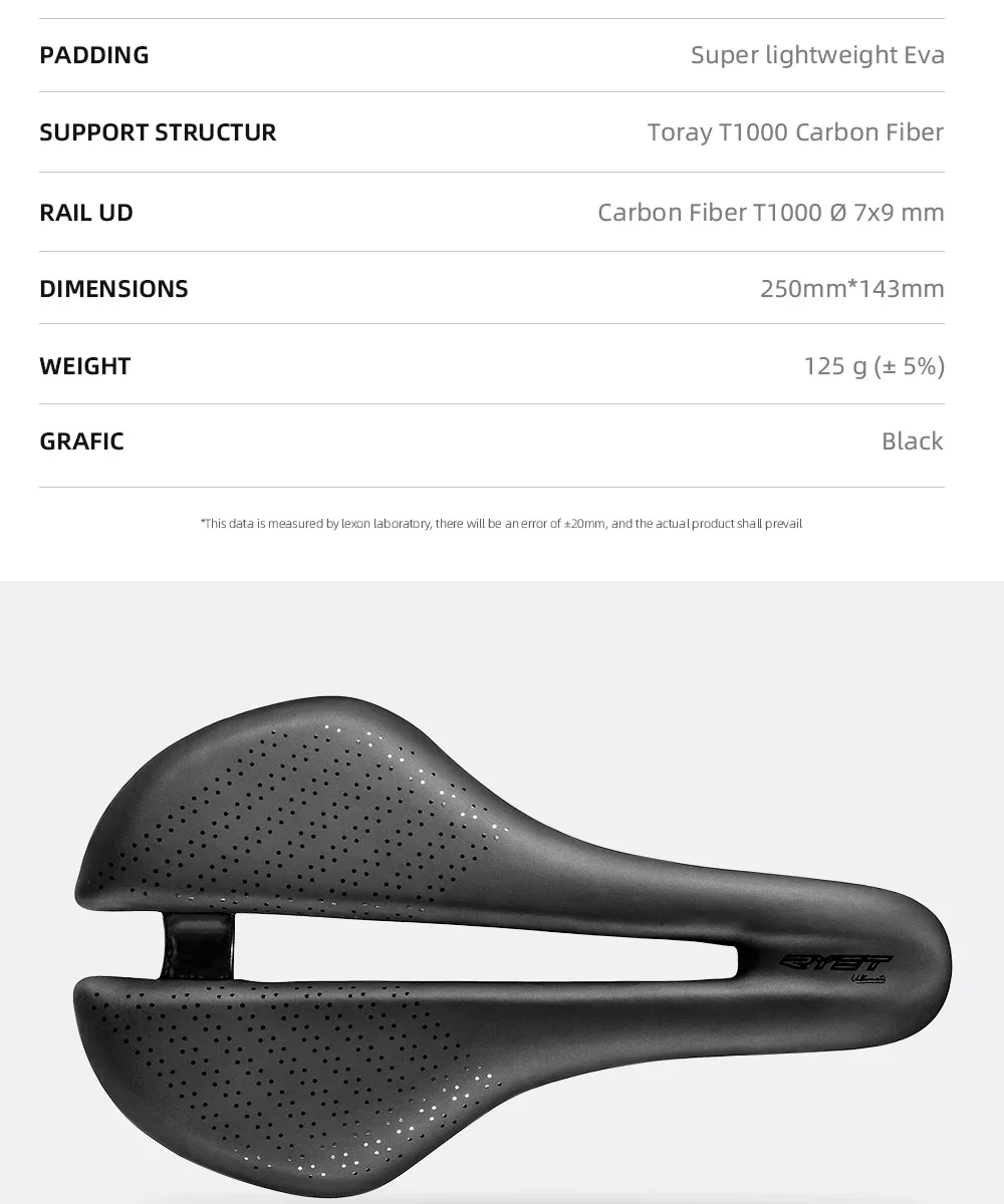 RYET Voll Carbon Fahrradsattel Ultraleicht MTB Racing PU Sitzsättel 125g Schwarz Rennradsitzkissen Radfahren ZubehörDer RYET Black Carbon-Sattel ist mit auffälligen Grafiken und speziellen Rennfunktionen versehen.Carbon-Schienen bieten leichten Halt in den anspruchsvollsten Situationen.Die Form ist so konzipiert, dass Ihr Becken frei bewegt werden kannwährend der Superflow-Aussparung den Druck auf den Damm reduziert.Ttechnische SpezifikationenANWENDUNGSBEREICH: Straße/MTBBASIS: VollcarbonRAILS: Übergroßes 7x9mm CarbonSCHAUM: EVAABDECKUNG: MikrogewebeFORM: AusschneidenABMESSUNGEN: 250 x 143 mmGEWICHT: 125 g ± 5 gGarantie: 1 Jahr GarantieSCHLÜSSIGENSCHAFTENSuperleichte KonstruktionEinteilige Carbonbasis und SchieneEntwickelt für Wettbewerbe auf höchstem NiveauKeine Kompromisse beim KomfortFARBE: Schwarz matt